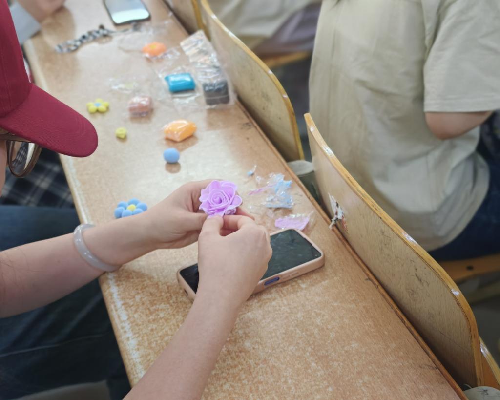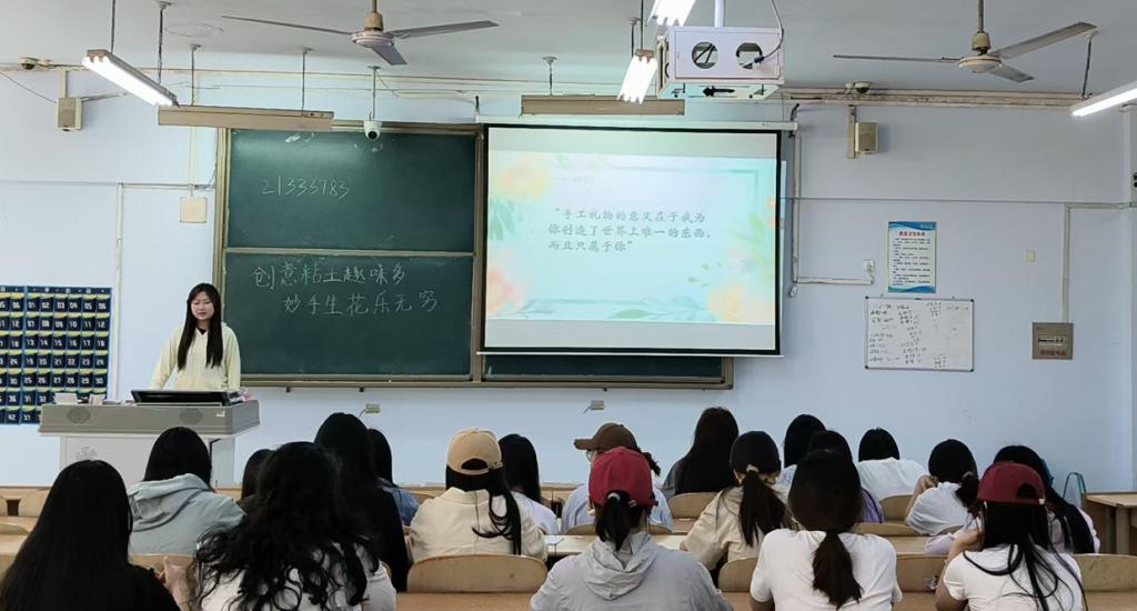 活动现场,主讲人先系统讲解了黏土制作技巧,为同学们的创作筑牢基础,并结合生动案例,深入浅出地阐释了艺术创作对情绪疏导的积极作用。在动手环节,五颜六色的黏土在同学们手中不断变换形态,原本普通的黏土在大家手中逐渐幻化成一朵朵栩栩如生的鲜花。创作过程中,同学们相互交流创作思路、彼此协助,遇到难题时积极请教,将内心世界与无尽创意通过指尖生动展现,学习与生活中的压力也在沉浸式创作中悄然舒缓。