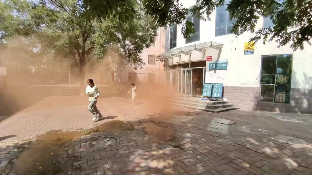 随着警报声骤然响起,同学们迅速作出反应。大家第一时间用湿毛巾捂住口鼻,按照预先规划的疏散路线,贴着墙面弯腰低姿前行,以整齐的队列有序撤离至安全区域。整个疏散过程中,队伍保持匀速行进,全程秩序井然,既没有发生拥挤踩踏现象,也未落下任何一名学生,得益于严谨的流程把控,演练得以安全顺利进行。疏散结束后,保卫处立即开展消防器材实操培训。工作人员详细讲解了灭火器、消火栓的操作要点,同学们全神贯注聆听讲解,并通过实际操作进一步掌握了消防技能。