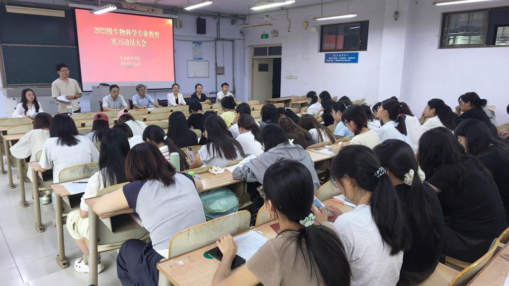 9月5日下午,beat365在线唯一官网于求实楼0112教室召开2023级生物科学专业教育实习动员大会,旨在扎实推进支教实习工作,提升师范生教育实习成效。学院主要负责人、学生工作分管负责人、教学工作分管负责人、系主任、辅导员、班主任老师,以及2023级生物科学专业全体学生参加了会议。