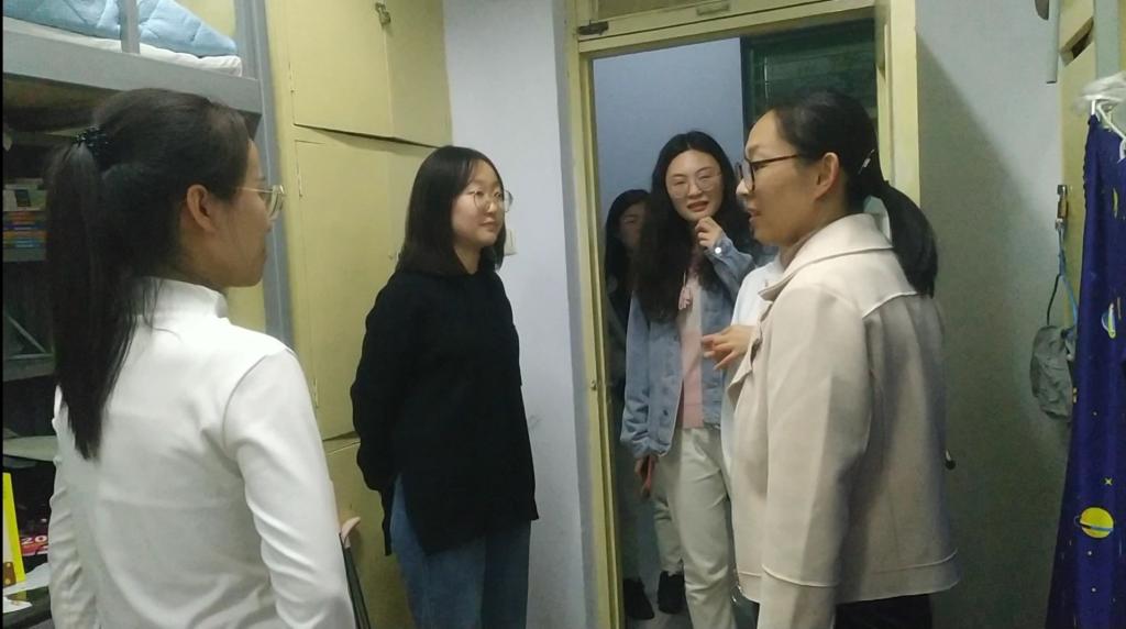 辅导员一行每到一处,查看了学生宿舍内部设施,并与学生进行亲切交谈。叮嘱同学要继续遵守学校有关疫情防控规定,落实“非必要,不外出”制度,对少数寝室存在环境脏乱差和安全隐患的问题,直接提出了批评,并明确要求限期整改,确保学生宿舍安全卫生。