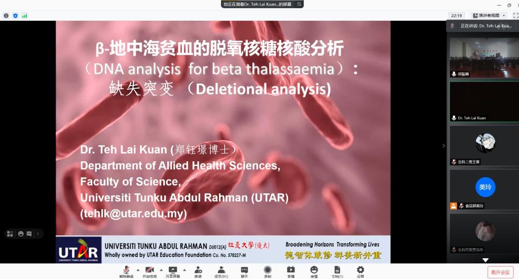 郑博士围绕β-地中海贫血的脱氧核糖核酸分析缺失突变向师生展开了讲解。郑博士讲到,β-地中海贫血是一组β-珠蛋白合成缺陷所致的有异质性的遗传病,近年来的研究揭示了导致β-地中海贫血的三十多种不同的基因突变,而这些突变涉及到基因表达过程的转录、RNA加工和mRNA翻译等步骤。近年来随着科技的发展,地中海贫血症的治疗有了很大的突破,她希望同学们可以不断学习科学文化知识,在未来为疾病的治疗做出贡献。课程最后,老师和同学积极向郑博士提出问题,郑博士也十分耐心的回答了他们的问题。师生们纷纷表示此次课程拓宽了他们的视野、丰富了专业知识,他们相信在一代又一代生科人的辛勤耕耘下,beat365在线唯一官网一定会稳步向前,创造更加美好的明天。
