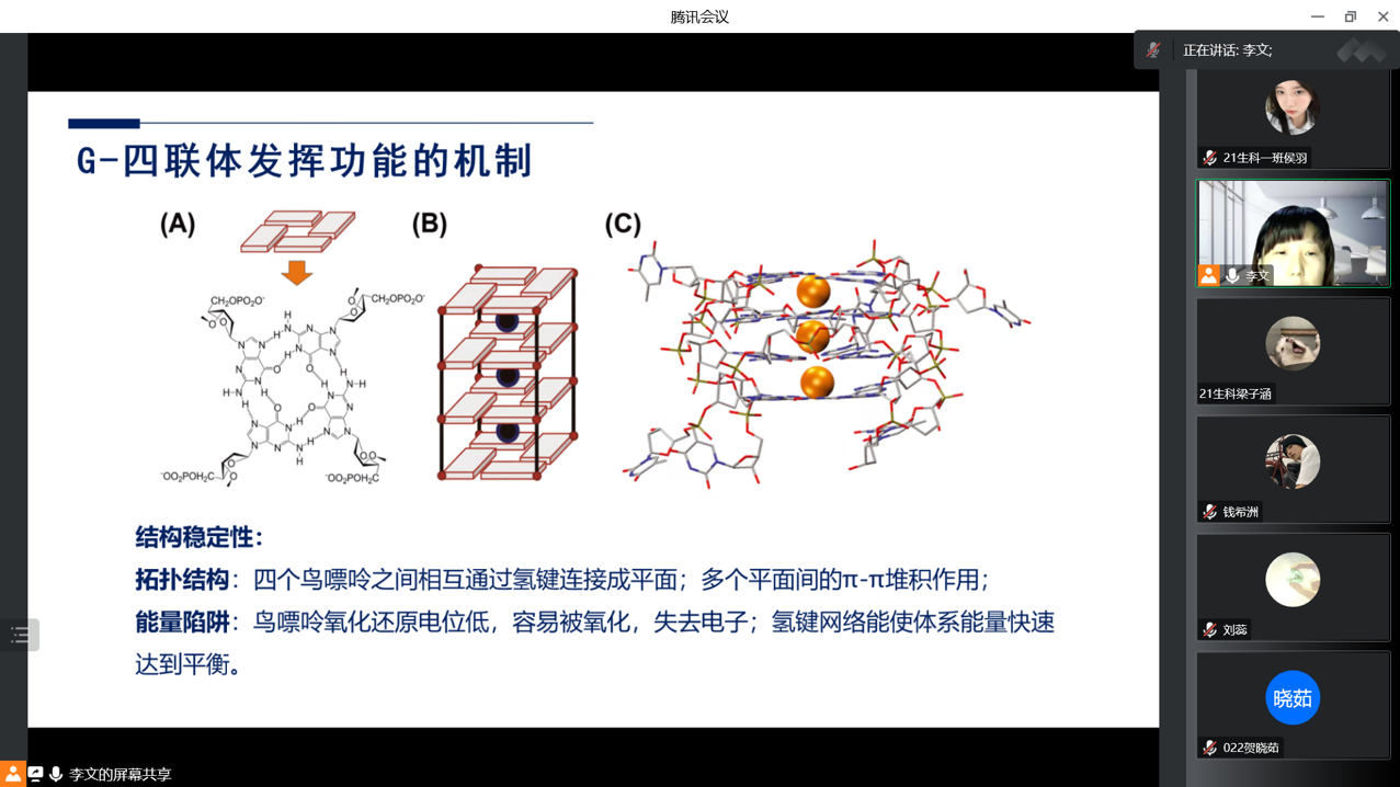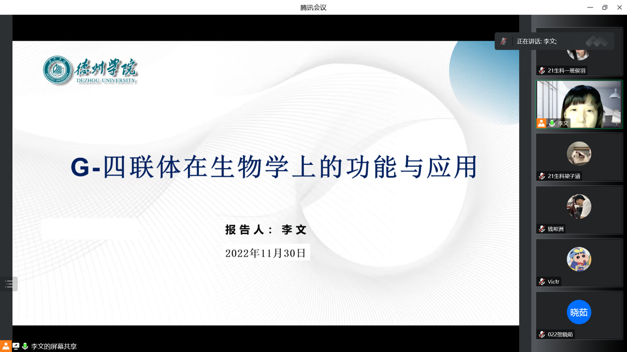 11月30日,为搭建学术交流平台,营造良好的学术文化氛围,beat365在线唯一官网通过腾讯会议举办线上“G-四联体在生物学上的功能与应用”专业前沿知识讲座。