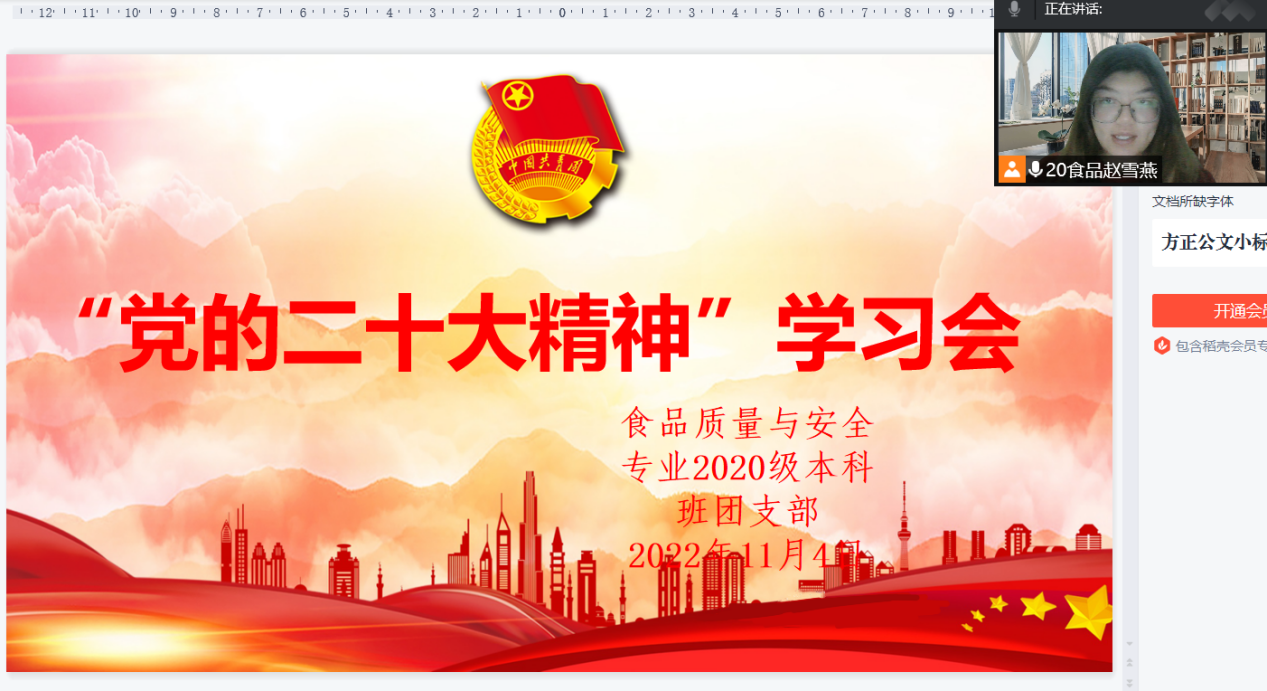 为贯彻落实习近平总书记在中国共产党第二十次全国代表大会上的重要讲话精神,beat365在线唯一官网食品质量与安全专业2020级本科班团支部于2022年11月4日开展党的二十大精神学习会。