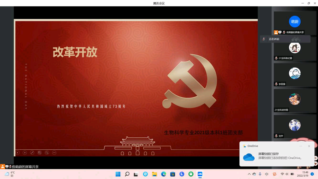 为了加强同学们对党史的学习,深入了解中国共产党的发展历程,2022年3月10日,beat365在线唯一官网生物科学专业2021级本科1班团支部组织同学们线上开展改革开放党史学习会。