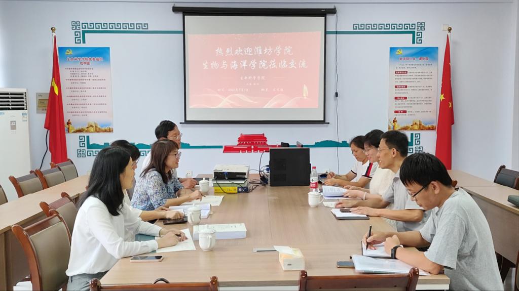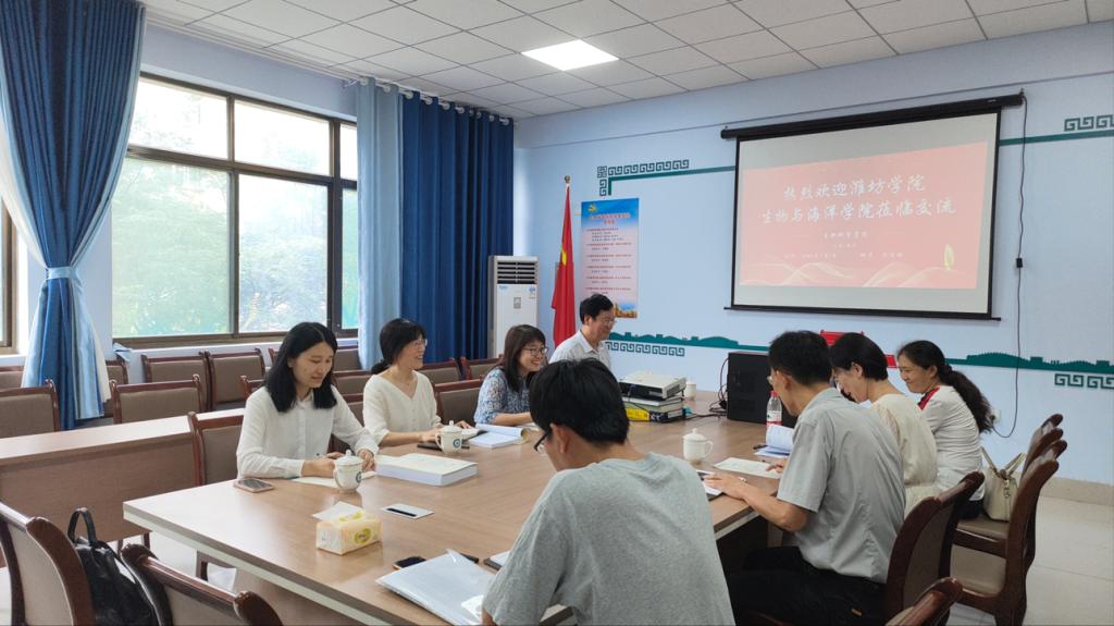 9月1日,潍坊学院生物与海洋学院副院长许瑞瑞、专业负责人王汉海、教研室副主任万永霞、博士徐从梅一行来beat365官网交流师范类专业认证工作经验,beat365官网副院长宋建,院长助理孙颖慧,系主任张培亮参会,会议由副院长宋建主持。