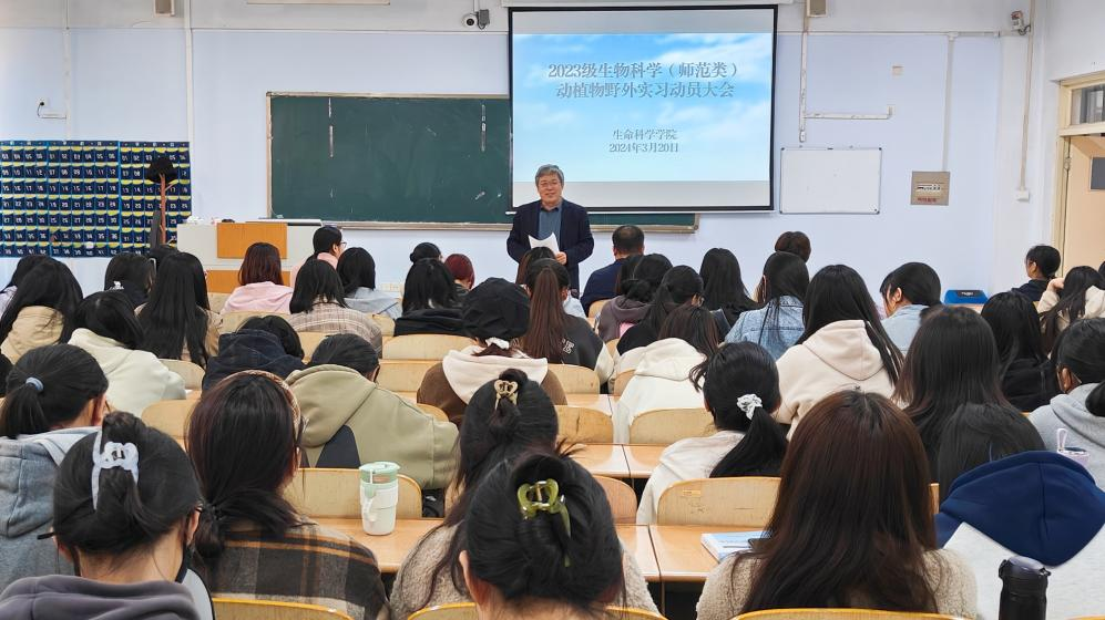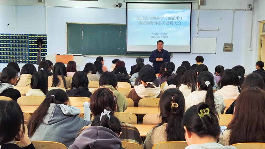 3月20日,beat365在线唯一官网于求实楼0107教室召开2023级生物科学(师范类)动植物野外实习动员大会。beat365在线唯一官网党委书记赵庆福、副院长魏振林、系主任韩硕、辅导员孙珍辉、专业课老师魏讯凡出席动员大会并发言。2023级生物科学专业全体学生参加。
