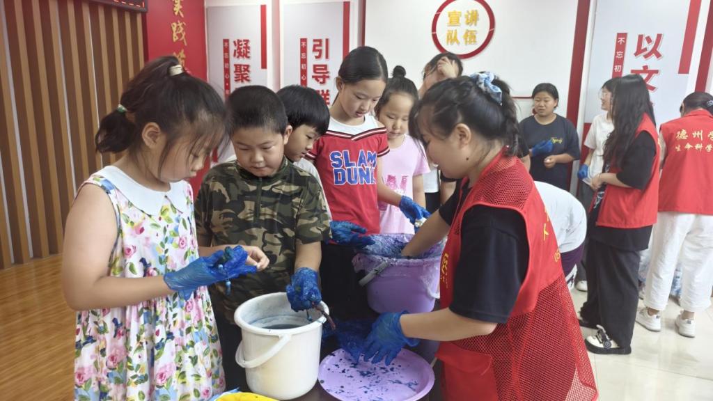 非遗扎染体验:孩子们在志愿者及社区专业人员的指导下,亲手制作蓝白相间的扎染作品,感受传统工艺的魅力。一布一染间,我们触摸到了中华文化的脉搏!