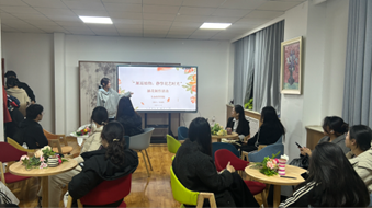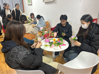 活动伊始,主讲人张瑞燃从“认识插花”切入,系统讲解了插花艺术的起源、不同流派特点及常用花材的特性与养护知识,让大家了解到不同植物在花艺作品中的角色。同时,她聚焦“插花小技巧”,结合实例演示了黄金分割构图、高低错落搭配、色彩和谐搭配等实用方法,帮助参与者快速掌握花艺创作的核心逻辑。在创作环节,大家充分发挥想象力与创造力,搭配花材、调整造型,将对生活的热爱融入每一个细节,原本零散的花材在同学们的手中变成一盆盆错落有致、独具匠心的花艺作品。