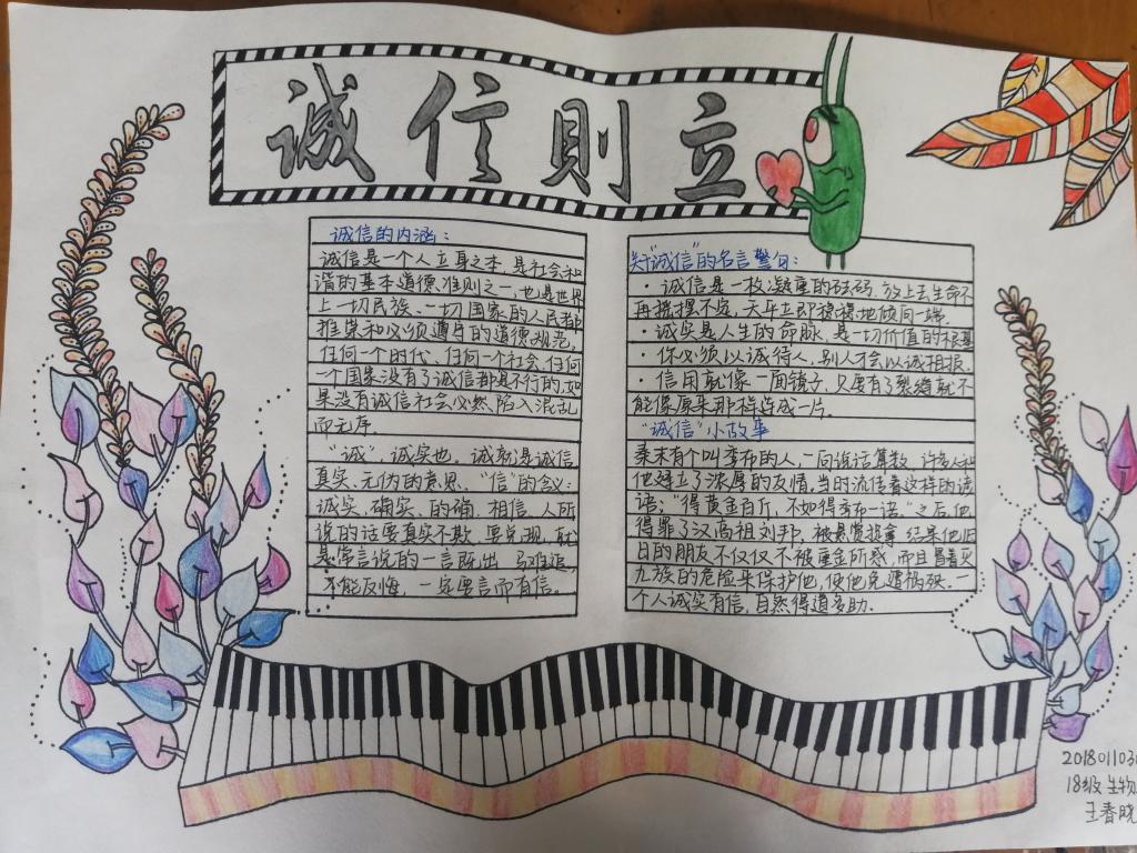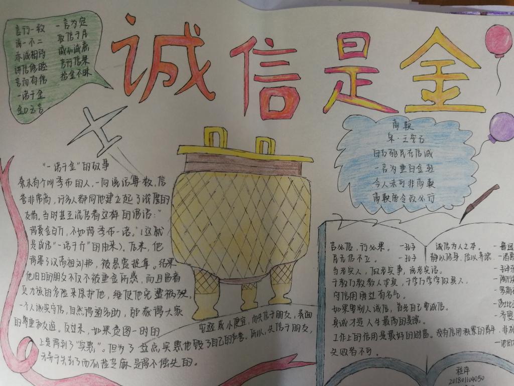 活动通知一经下发,同学们积极踊跃报名参加此次手抄报活动。同学们精心准备,设计制作的手抄报版面美观,内容丰富,图文并茂。他们用手中的纸笔来展现出自己对诚信的认识,通过绘画的方式来传递身边的正能量。一份份手抄报充分表达了同学们对诚信的重视。beat365在线唯一官网还通过展板张贴同学们的优秀作品,以此来宣传弘扬诚行天下,一诺千金的主题思想。