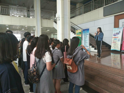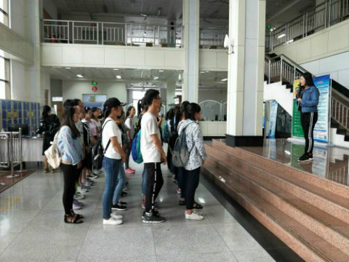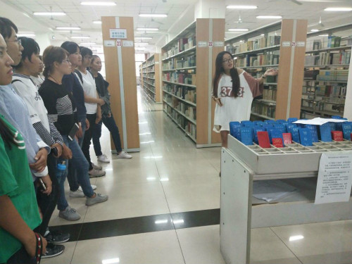 在进入图书馆参观之前,同学们先在生化楼门口列队集合,后由学生会成员带队,分班级有序入馆学习。首先进行的是图书馆书助理人员,对图书馆进行简单介绍,使同学们知道了图书馆能为全校师生提供图书、期刊的外借和阅览、参考咨询、电子阅览等多种服务。之后由另一位图书馆事务助理人员带领同学们参观图书馆,学习借书卡的使用方法、电子阅览室的注意事项等注意要点。同学们惊讶于图书馆里琳琅满目的书籍,对书的海洋产生了向往之情。
