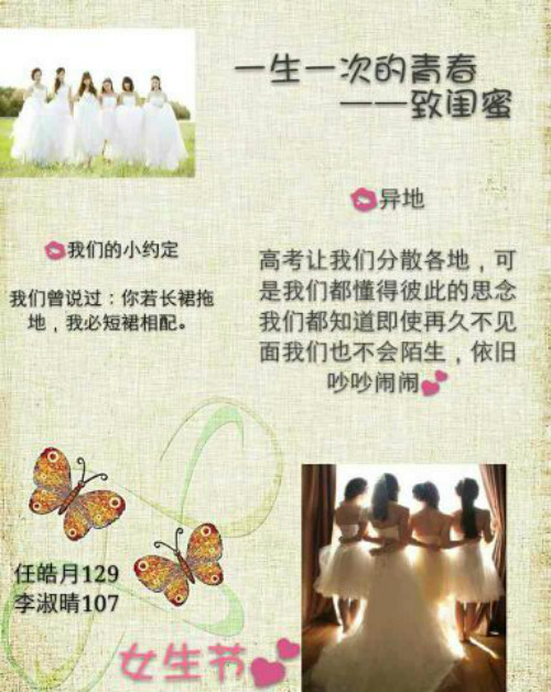 对于女生的祝福采用电子版海报的形式来体现,海报的内容可以是闺蜜间的密语、好友间的温情、朋友间的关爱。通过海报,同学们将平时说不出口的话表达了出来,加深了朋友间的感情。海报内容感情真挚,积极向上,体现出了同学之间的温馨情谊。活动后期,由于报名人数众多,所以经过几天筛选,选出的优秀作品将在beat365在线唯一官网微信平台上进行展示,届时便于同学们观看。