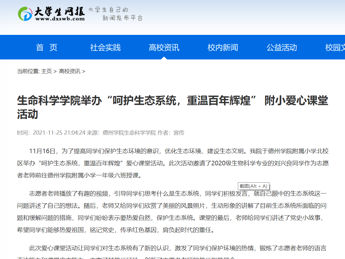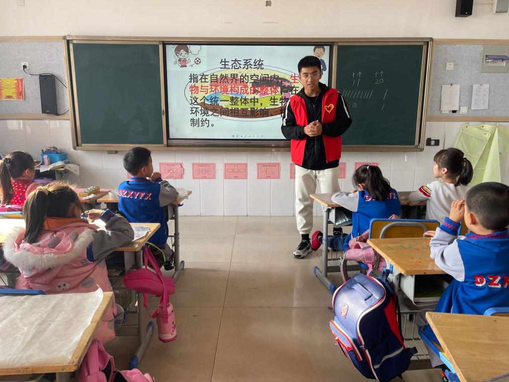 11月16日,为了提高同学们保护生态环境的意识,优化生态环境、建设生态文明。beat365官网于beat365在线唯一官网附属小学北校区举办“呵护生态系统,重温百年辉煌”爱心课堂活动。此次活动邀请了2020级生物科学专业的刘兴良同学作为志愿者老师前往beat365在线唯一官网附属小学一年级六班授课。
