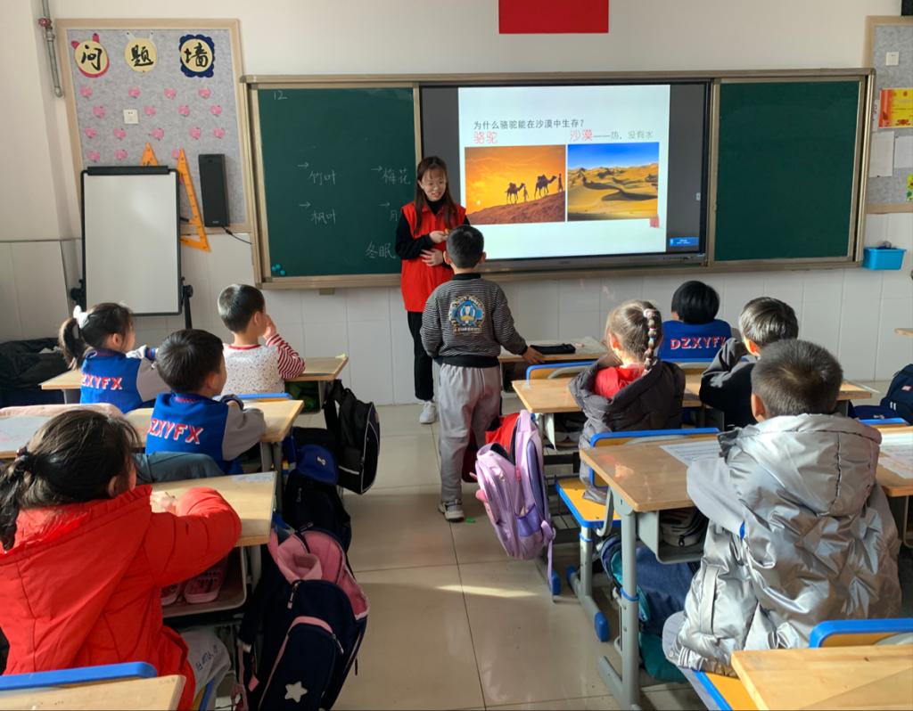 志愿者老师通过播放视频,激发了同学们的兴趣,向他们讲述了动物是如何面对生存困境的,同学们积极举手回答问题,课堂气氛活跃。此外,志愿者老师还向同学们科普了不同动物的生存技巧以及其中所蕴含的智慧,开阔了同学们的视野,让他们对动物生存有了进一步的了解,坚定了他们保护动物的决心。课堂最后,志愿者老师播放了党史教育的相关视频,并为同学们简单阐述了中国共产党的性质,让他们树立铭记党史、热爱祖国的情怀。