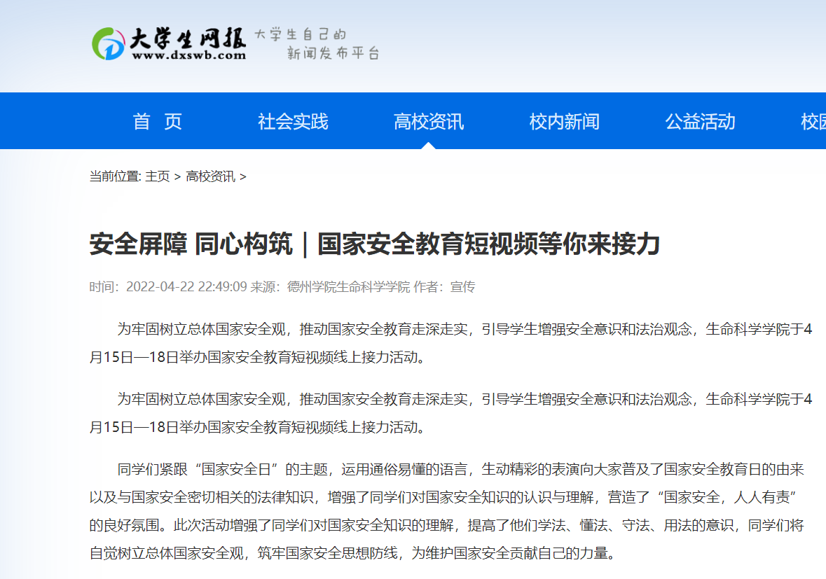 为牢固树立总体国家安全观,推动国家安全教育走深走实,引导学生增强安全意识和法治观念,beat365在线唯一官网于4月15日—18日举办国家安全教育短视频线上接力活动。