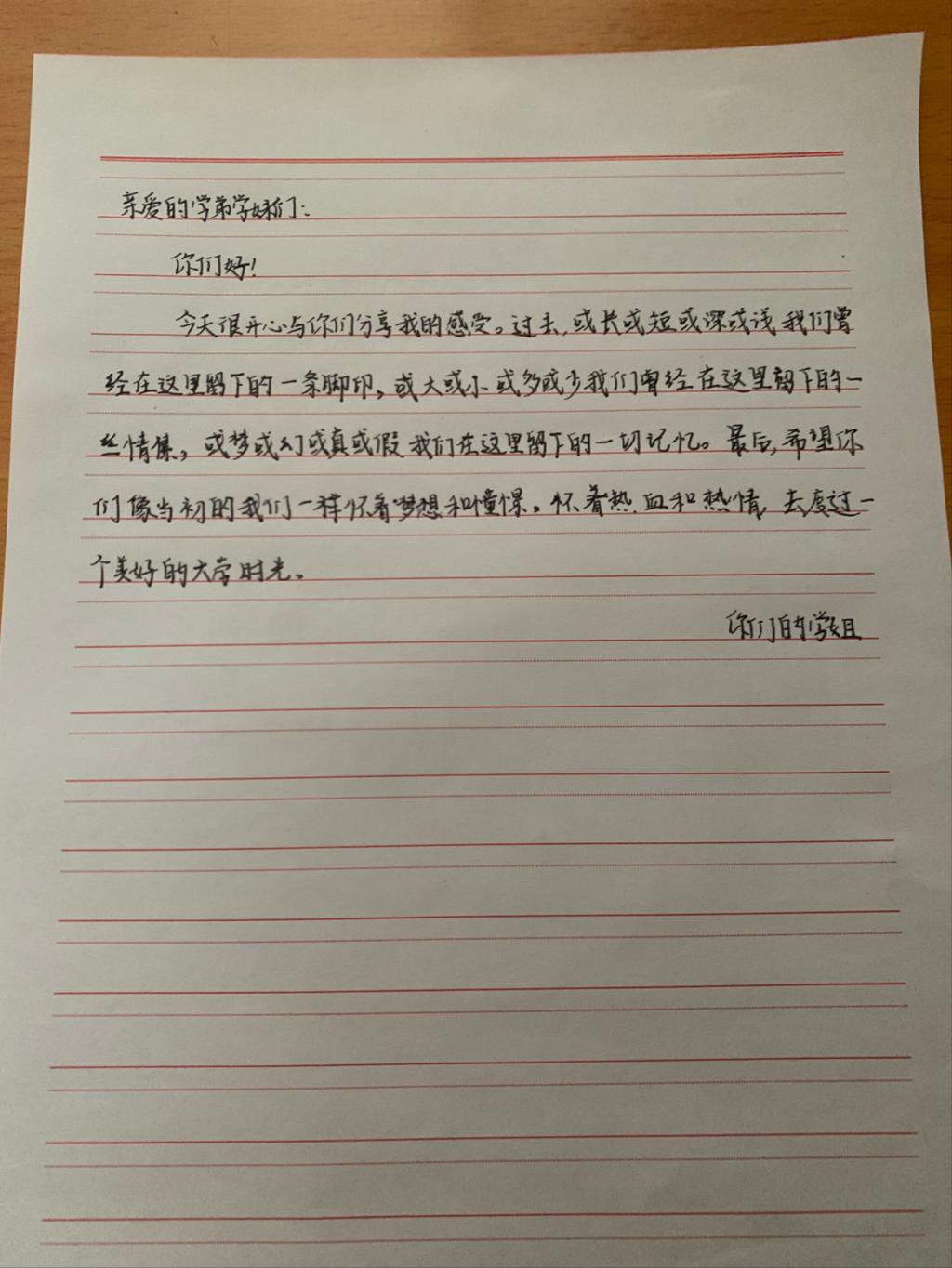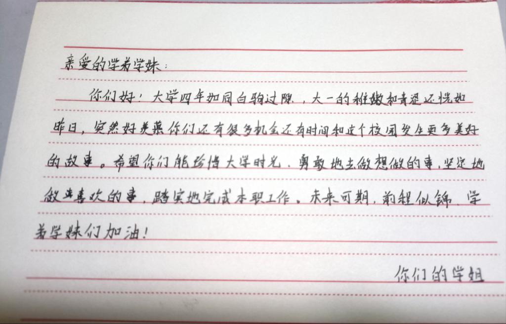 毕业生以寝室为单位,以信传情,以字达意,提笔记录大学成长的收获感悟、令人难忘的寝室故事、学习生活等方面的经验,并将彩铅勾勒的简笔画、精心制作的干花折纸附于信封之上,将美好祝愿真挚地传递给即将入住的新生,一段段文字、一封封书信成为毕业生给学弟学妹大学生活的路标指引。