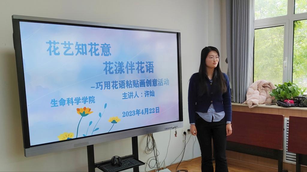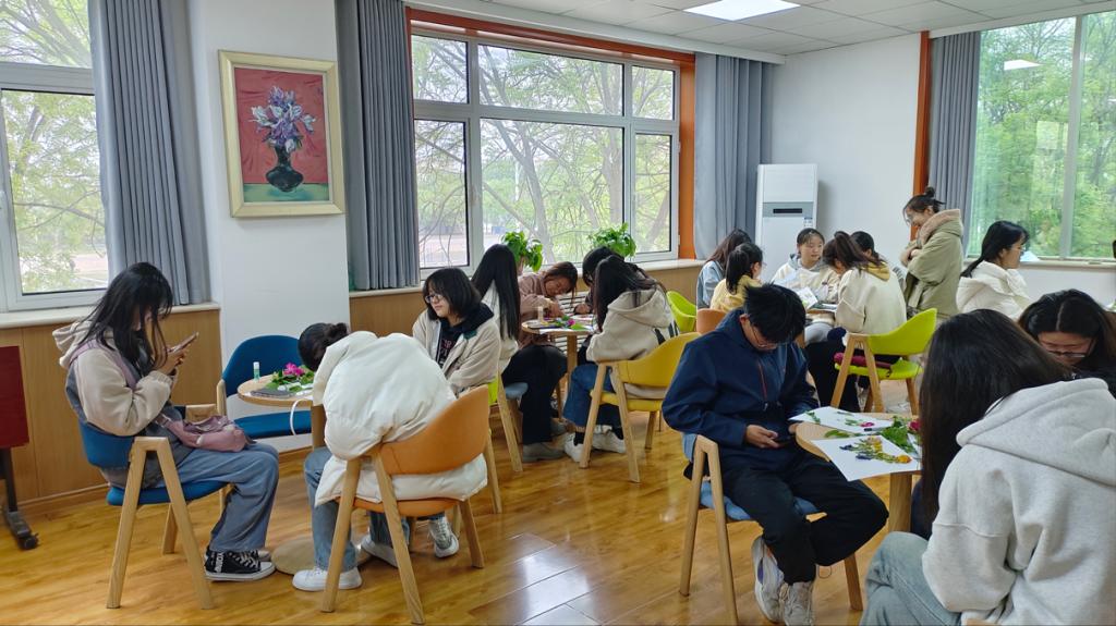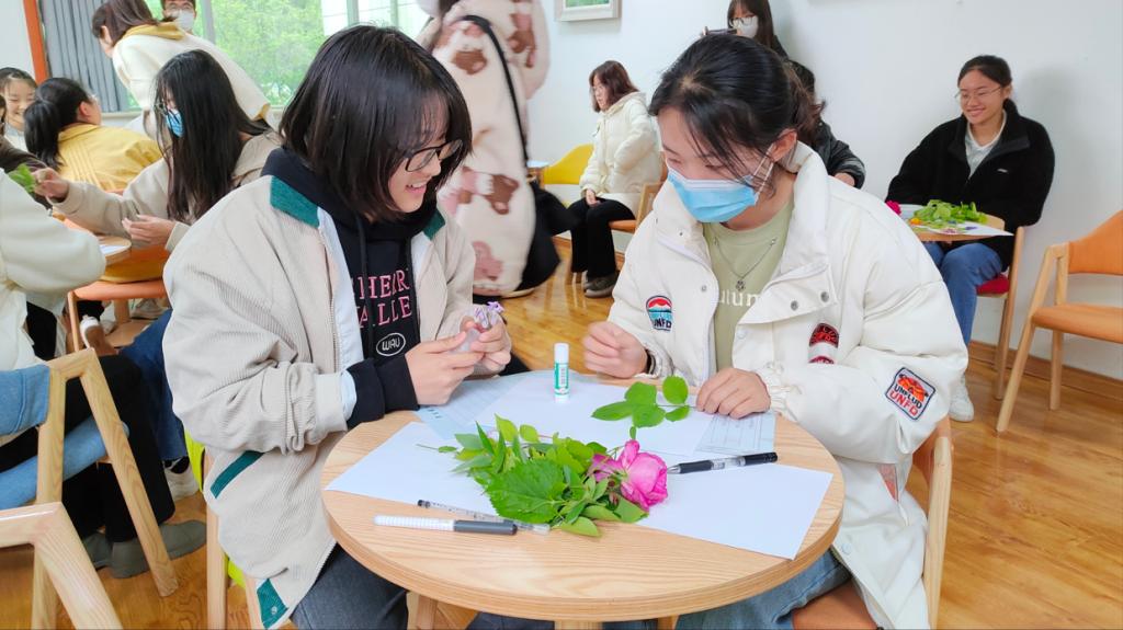 活动现场,2022级生物科学专业的许灿同学详细讲解了花艺粘贴画的相关知识,同学们用花叶和胶带制作精美的粘贴画作品,并分享各自的设计创意。随后,许灿同学用生动的语言向同学们讲解了花语的由来、发展及典型代表,并通过花语引导同学们品味人生,感悟花语的独特魅力。活动结束后,同学们以小组为单位,就花语的含义这一话题分享见解,现场氛围十分活跃。