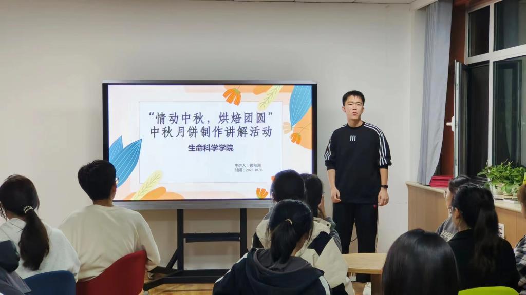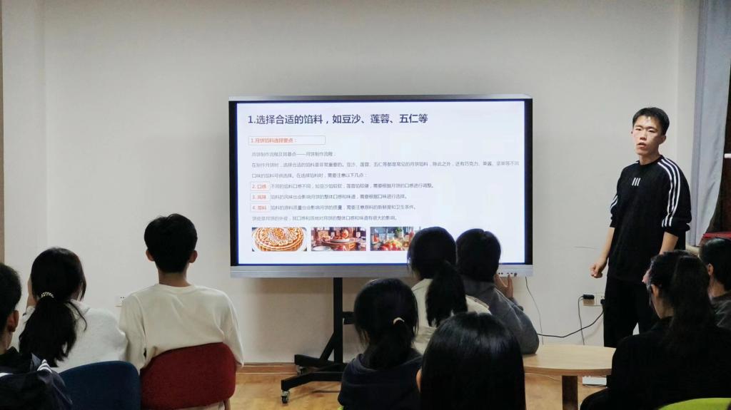 活动中,主讲人播放了形象生动的视频,引领大家走进中秋这个源远流长的节日,深入了解其中蕴含的习俗文化。随后,他详细地讲解了月饼制作的各个环节,用通俗易懂的语言让同学们理解了月饼制作的原理和技巧,激发了大家亲手制作月饼的兴趣。在讲解结束后,主讲人向同学们分发了提前准备好的月饼,让大家品尝并分享了对这次活动的感想和收获。