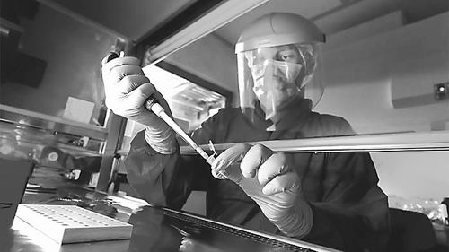 Matthias Meyer正在一个清洁间工作,帮助寻找一种从古代土壤中获取人类DNA的方式。