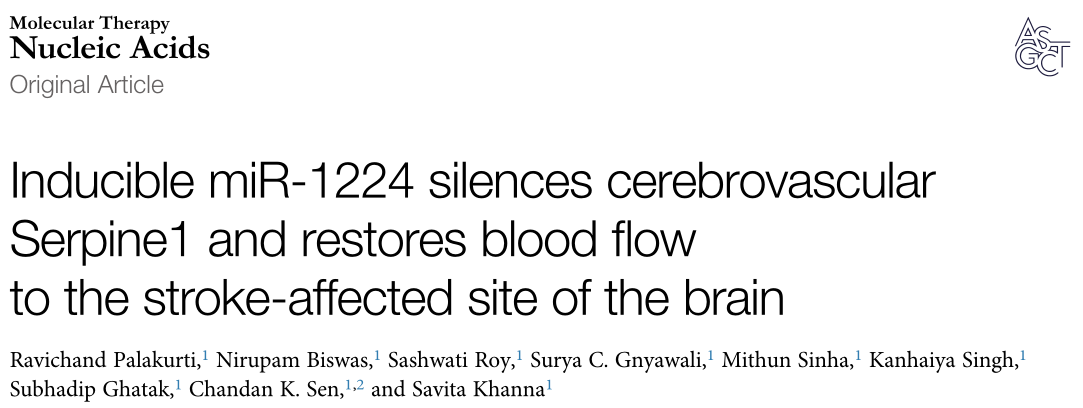 近日,来自印第安纳大学医学院的研究者们在Molecular Therapy: Nucleic Acids杂志上发表了题为“Inducible miR-1224 silences cerebrovascular Serpine1 and restores blood flow to the stroke-affected site of the brain”的文章,该研究揭示了SERPINE1具有恶化中风结果的脑血管功能。依赖于MIR-1224的SERPINE1抑制可以通过饮食TCT和小分子抑制剂TM5441实现。