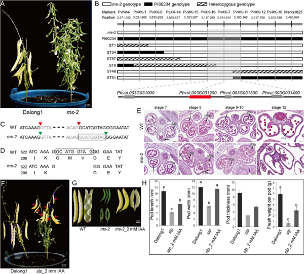 中国科学院东北地理与农业生态研究所利用SNP测序和自主设计的菜豆InDel分子标记,通过图位克隆的方法精细定位了菜豆雄性育性基因MS-2为Phvul.003G031200基因(图B);在ms-2突变体中Phvul.003G031200基因剪切位点发生变异,使得蛋白质序列缺少3个氨基酸(图C-D);利用石蜡切片观察小孢子体发育过程,发现MS-2基因的剪切位点变异导致绒毡层降解提前是ms-2突变体雄性不育的原因(图E)。ms-2突变体可结实大量的无籽肉荚,外源喷施2 mM生长素物质吲哚乙酸(IAA)能使ms-2突变体上的肉质无籽荚的荚长、荚宽、荚厚和单荚鲜重显著增加(图F-H),且体积增大的无籽肉荚具有加工或直接食用的潜能。本研究定位与克隆了菜豆雄性育性基因MS-2,明确了该基因突变导致菜豆不育的机理。MS-2基因可应用于培育肉质无籽荚菜豆品种,具有很好的应用价值,这为杂种优势的利用奠定了坚实的理论基础。