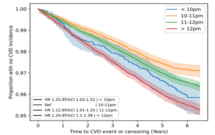 在平均5.7年的随访期间,有3172名参与者患上了心血管疾病,其中有1371人在午夜后入睡,1196人在晚上11点后的一个小时内入睡,473人在晚上10点后的一个小时内入睡。只有132人在晚上10点前入睡。
