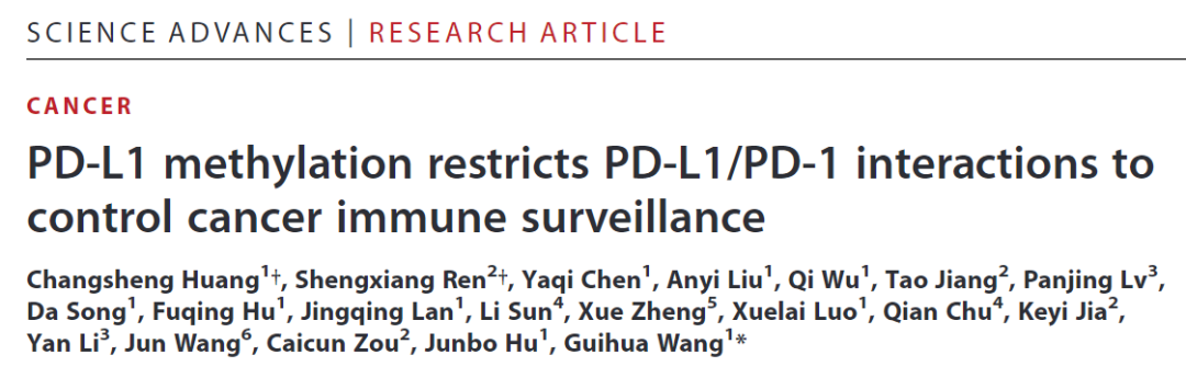 2023年5月26日,华中科技大学同济医学院附属同济医院王桂华教授团队在 Science 子刊 Science Advances 上发表了题为:PD-L1 methylation restricts PD-L1/PD-1 interactions to control cancer immune surveillance 的研究论文。