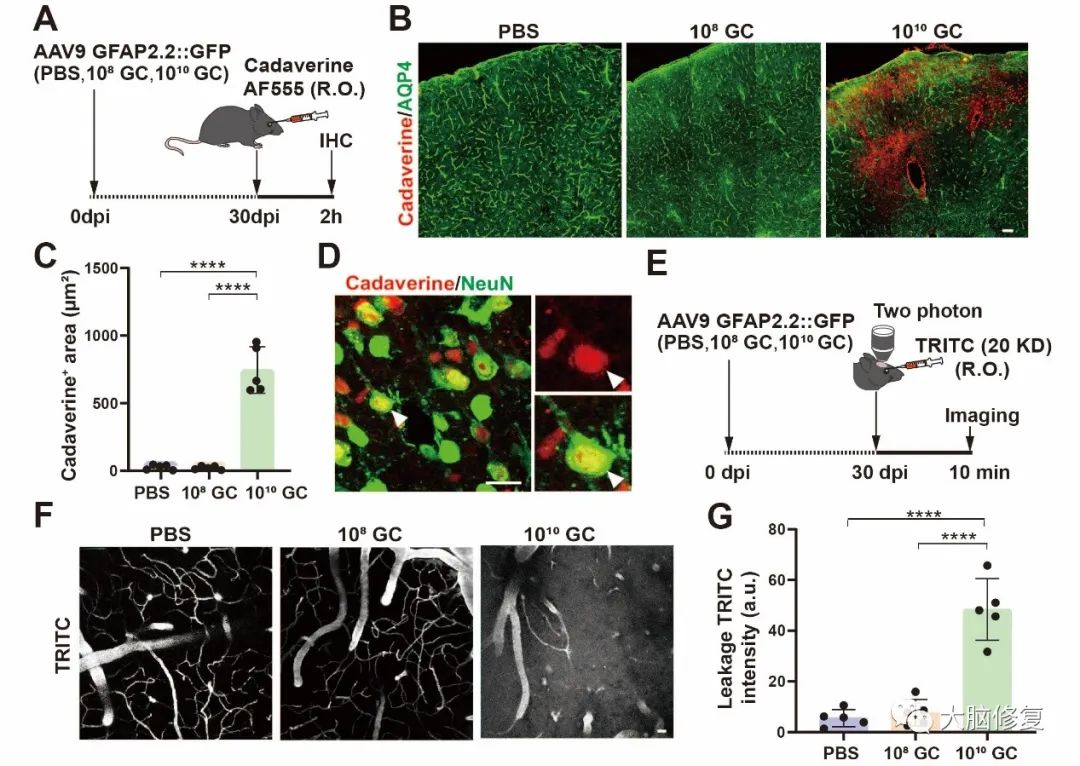 图1:通过血管染料和双光子活体成像揭示高滴度AAV造成小鼠大脑血脑屏障破坏