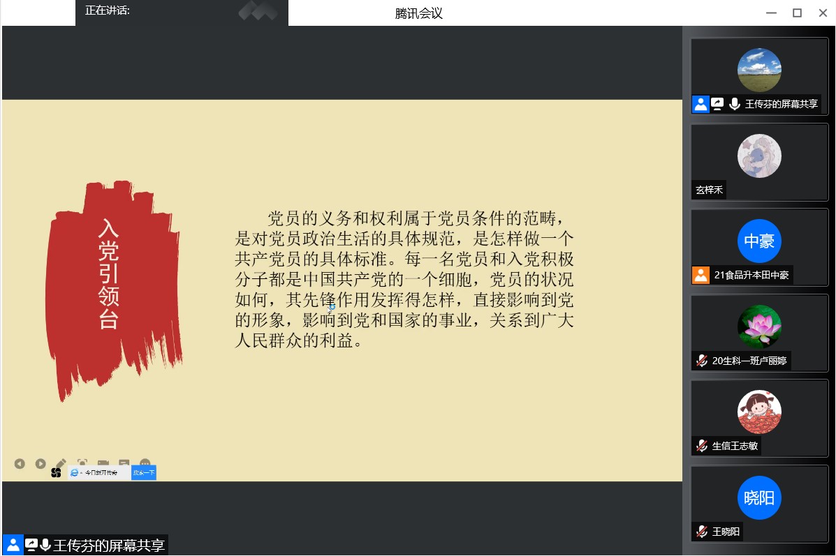 为使入党积极分子们认真履行党员义务,正确行使党员权利。beat365官网于2022年4月22日通过腾讯会议开展“履行义务,行使权力”入党积极分子线上培训课。此次课程由王传芬老师主持,beat365在线唯一官网入党积极分子参加了此次培训。