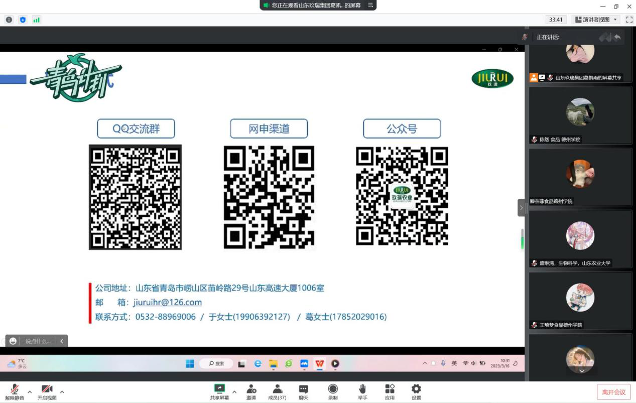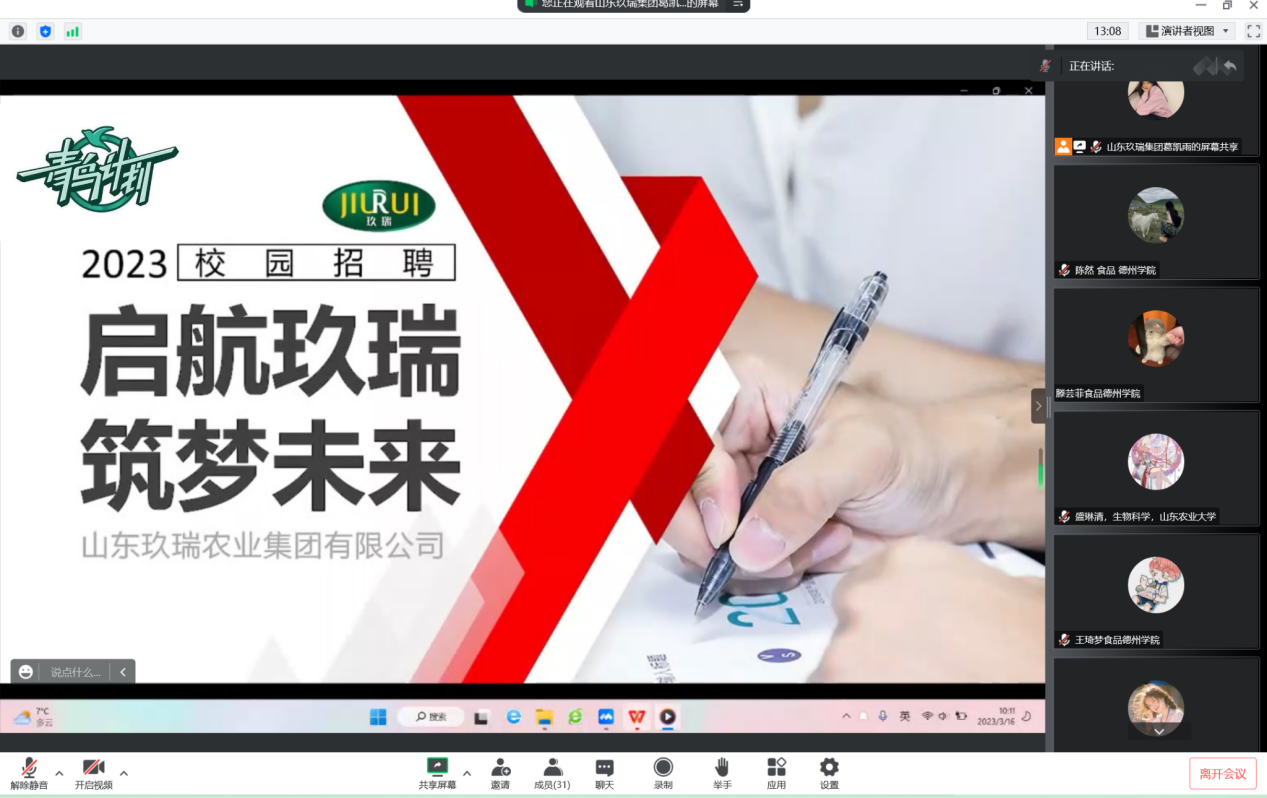 2023年3月16日,为贯彻落实2023届毕业生的创业就业工作,进一步了解就业信息,beat365在线唯一官网通过腾讯会议组织毕业生参加山东玖瑞农业集团有限公司线上招聘宣讲会。