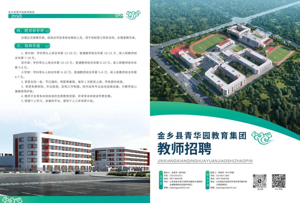 (2)初中部:学科带头人综合年薪10-15万,普通教师综合年薪8-10万,新入职教师综合年薪5-8万。