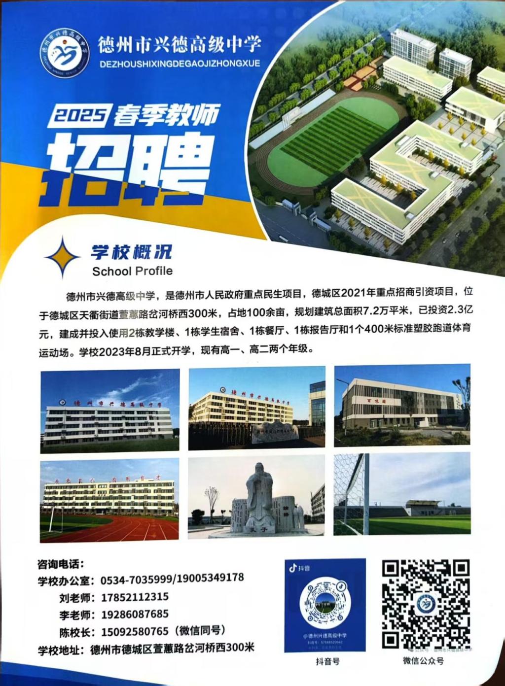 德州市兴德高级中学,是德州市人民政府重点民生项目,德城区2021年重点招商引资项目,位于德城区天衢街道萱蕙路乞河桥西300米,占地100余宙,规划建筑总面积7.2万平米,已投资2.31亿元,建成并投入使用2栋教学楼、1栋学生宿舍、1栋餐厅、1栋报告厅和1个400米标准塑胶跑道体育运动场。学校2023年8月正式开学,现有高一、高二两个年级。