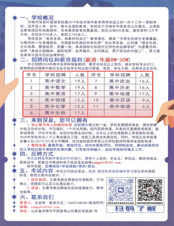 2.学校实行多劳多得、优劳优酬、按岗设酬,薪随岗变的薪酬发放机制,在胜任岗位工作的前提下,高中部教师年薪10-15万左右。