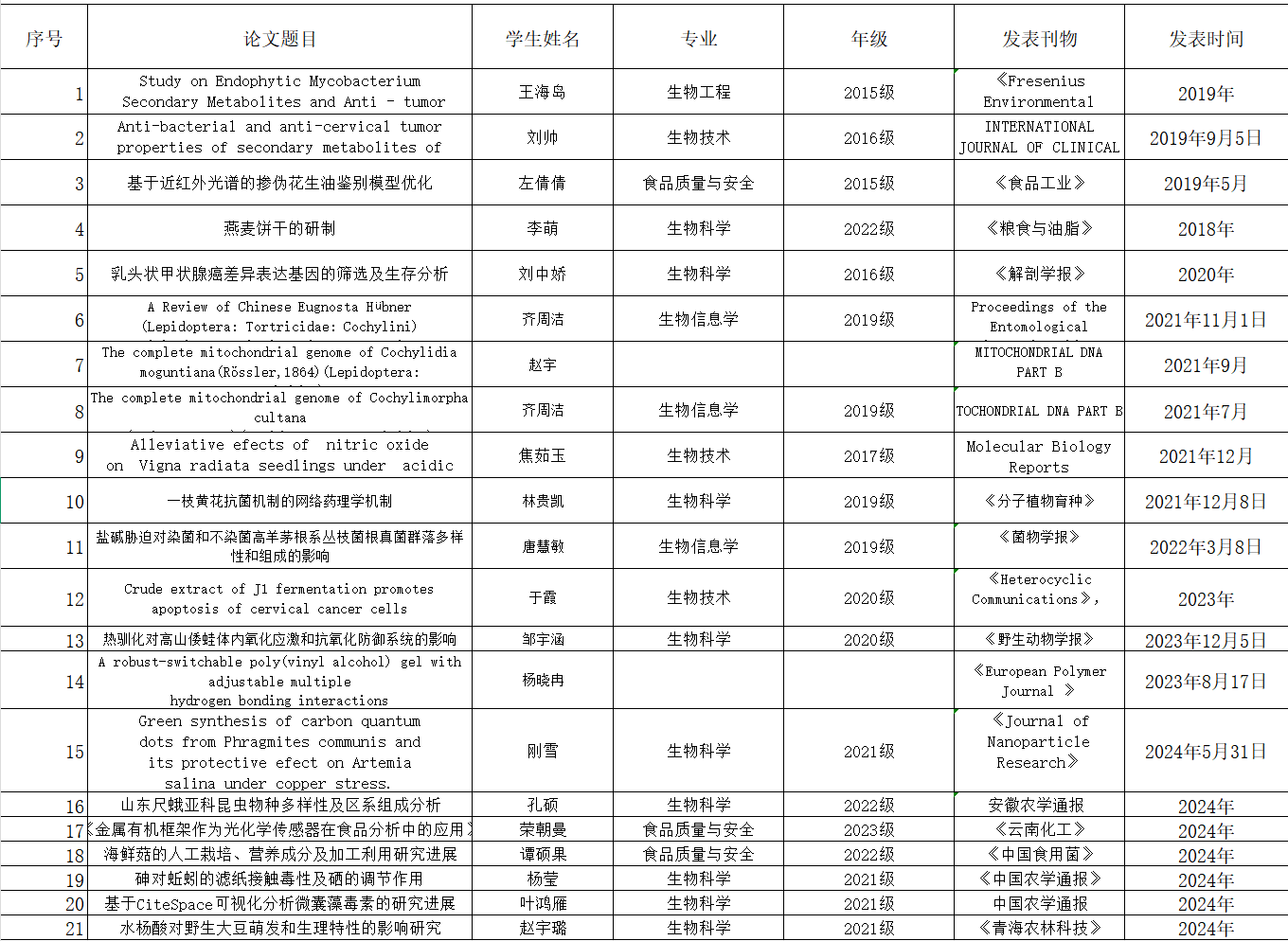 学生发表论文情况一览表